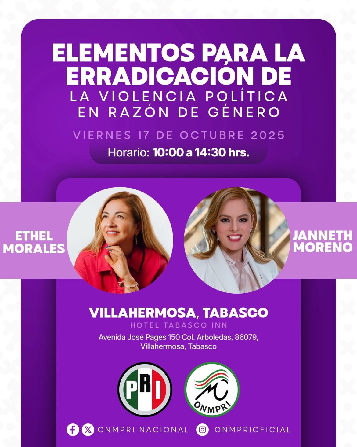 #Villahermosa, #Tabasco || El Partido Revolucionario Institucional (PRI) Tabasco y el Organismo Nacional de Mujeres Priistas (ONMPRI), anunciaron la realización del curso “Violencia Política de Género: Elementos para la erradicación”, que se llevará a cabo este viernes 17 de octubre, de 10:00 a 14:30 horas, en el Hotel Tabasco Inn de Villahermosa.