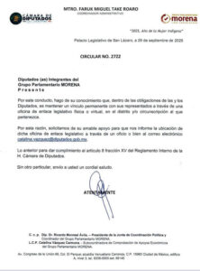 El oficio número 2722, ordena a las y los legisladores informar la ubicación de sus oficinas o devolver el dinero. El documento fue girado también a las áreas administrativas del grupo parlamentario, advirtiendo que el incumplimiento implica violar obligaciones legales y reglamentarias.