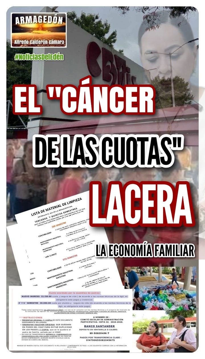 El CBTIS 32 y los demás planteles de dicho organismo son una bomba de tiempo porque aprovechando las inscripciones están abusando de la necesidad de los padres de familia de inscribir a sus hijos. Ubiquemos el impresionante monto que reciben: Son casi 850 alumnos de nuevo ingreso son 1 millón 704 mil pesos y 1700 alumno de reinscripción son 2 millones 630 mil pesos que hacen un total de 4 millones 500 mil pesos por semestre y 9 millones de pesos al año sólo en el plantel 32 que nadie sabe dónde queda, cómo se gasta o para qué, porque la SEP tiene presupuesto para todo eso. En lo dicho: el “cáncer de las cuotas” mancilla la economía familiar.
