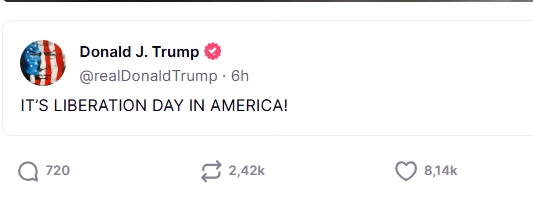 El presidente de Estados Unidos, Donald Trump, publicó un enigmático mensaje en su red social Truth Social: “IT’S LIBERATION DAY IN AMERICA!” (“¡ES EL DÍA DE LA LIBERACIÓN EN AMÉRICA!”), que ocurre en la antesala del esperado anuncio oficial sobre la imposición de nuevos aranceles a productos importados de diversas regiones del mundo, que llevaría a Washington a recuperar el control económico y castigar la competencia desleal.