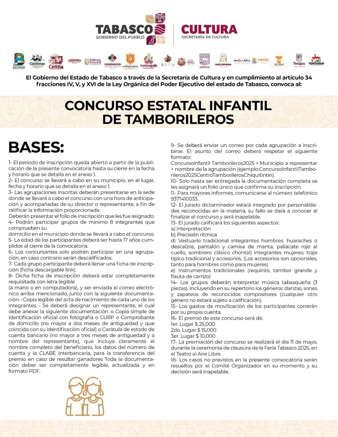#Villahermosa|| La Secretaría de Cultura del estado de Tabasco convoca a todas las agrupaciones infantiles de tamborileros a participar en el Concurso Estatal Infantil de Tamborileros 2025, un evento que busca preservar y fortalecer una de las expresiones musicales más representativas de nuestra identidad tabasqueña.