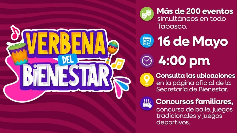 Con el objetivo de fomentar la convivencia familiar y comunitaria, el Gobierno estatal invita a la población en general a la Verbena del Bienestar que se llevará a cabo este viernes 16 de mayo a partir de las 4:00 de la tarde, de manera simultánea en los 17 municipios del estado.