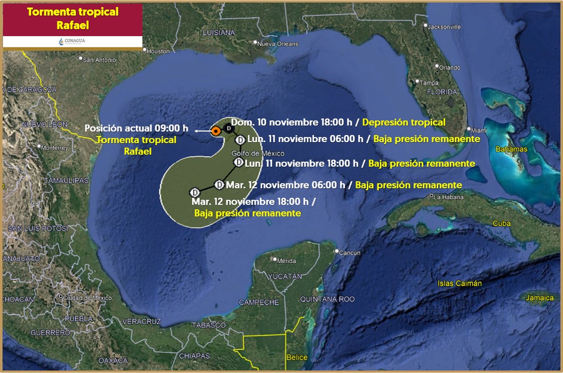 Ciudad de México.- La circulación de la tormenta tropical Rafael reforzará la probabilidad de lluvias puntuales fuertes en la península de Yucatán. El sistema continúa debilitándose en aguas del Golfo de México.